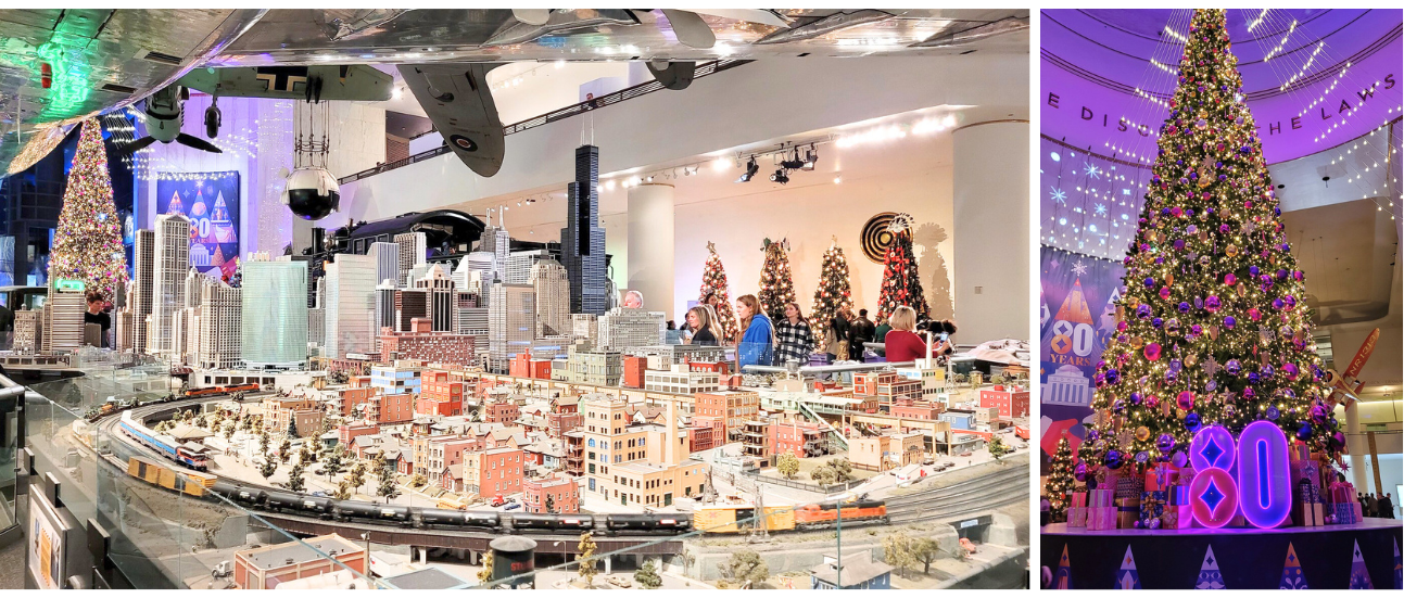 Nous avons pris directement nos billets au guichet de la gare State & Washington (à côté de Millennium Park) pour S Hyde Park & 56th Street . Une fois arrivés à l’arrêt, il nous a suffit de marcher 5 minutes pour arriver au gigantesque musée. Nous avons été scotchés des décorations pendant cette période de Noël, il y avait un immense sapin mais aussi plein de petits petits sapins pour chaque pays du monde avec les spécialités accrochées.