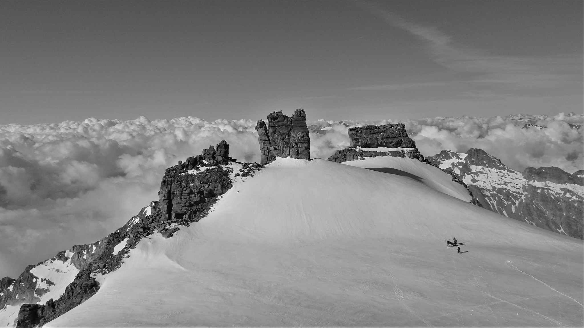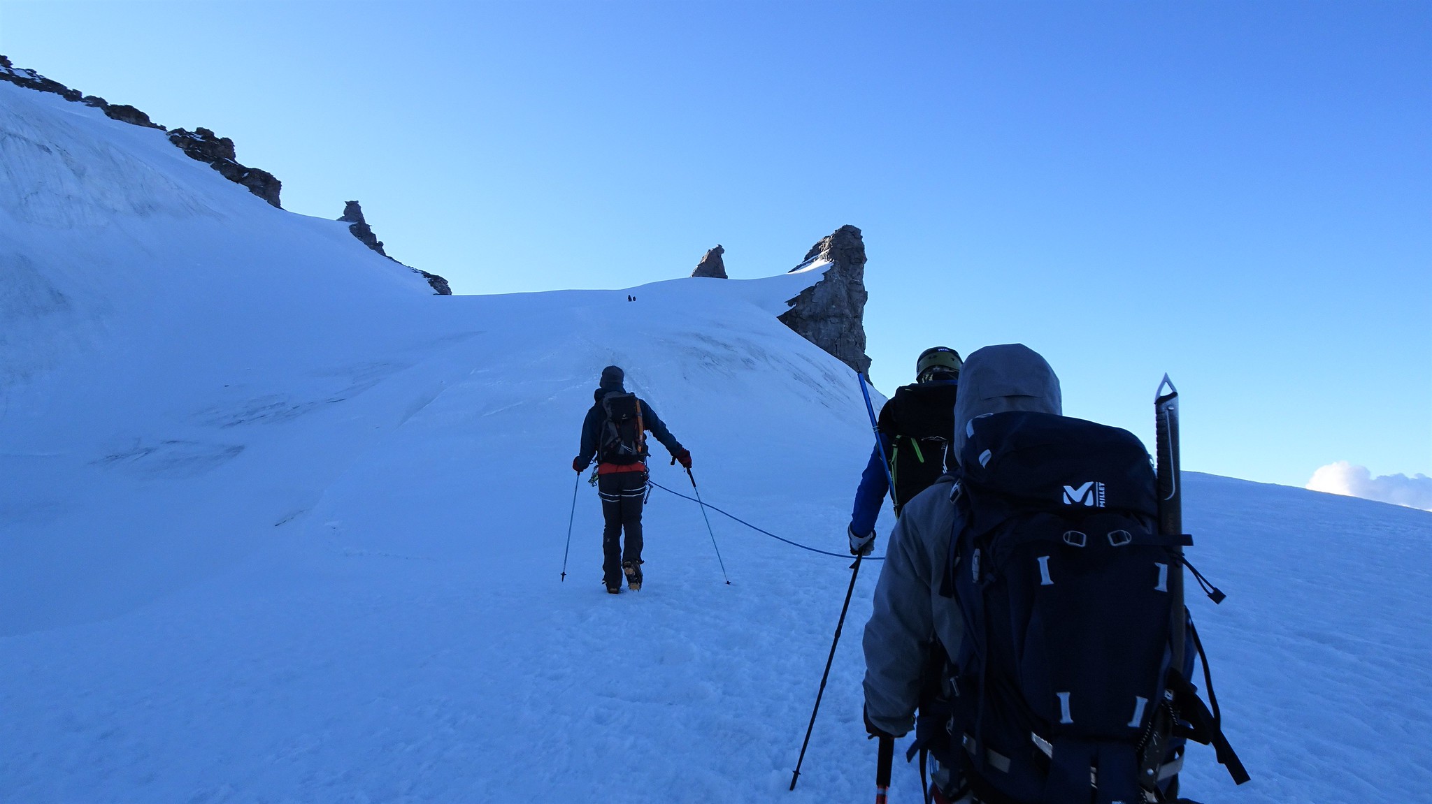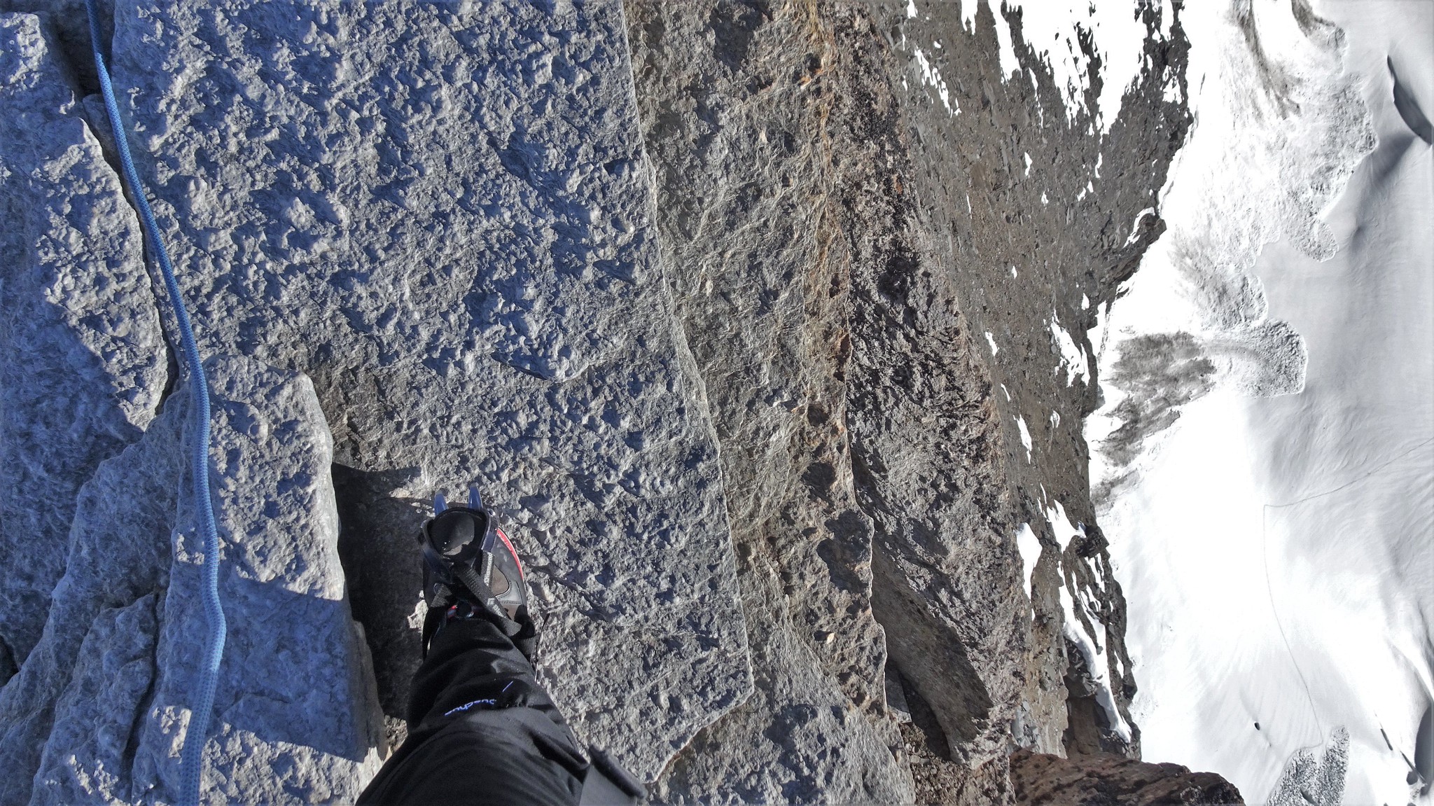 Ce dernier bout est une barre rocheuse qu’il faut continuer à escalader, encordés. Vu de loin, ça n’a pas l’air si terrible, mais ce que l’on ne voit pas, c’est que de l’autre côté il y a un vide énorme.